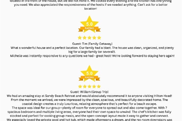 Dustin & Michelle Kennedy are South Carolina residents who love to vacation in Hilton Head. They bought their first home in Hilton Head in 2020 and love the area so much they decided to buy another one. They bought this amazing home in June 2021. After spending over a month renovating the home from head to toe and bringing it back to life, they are now proudly offering this beauty on the rental market. Having younger kids, they love that it has a pool and hot tub and is so close to the beach. Dustin & Michelle love entertaining friends and family members and making many great memories at Sandy Beach Retreat.Location